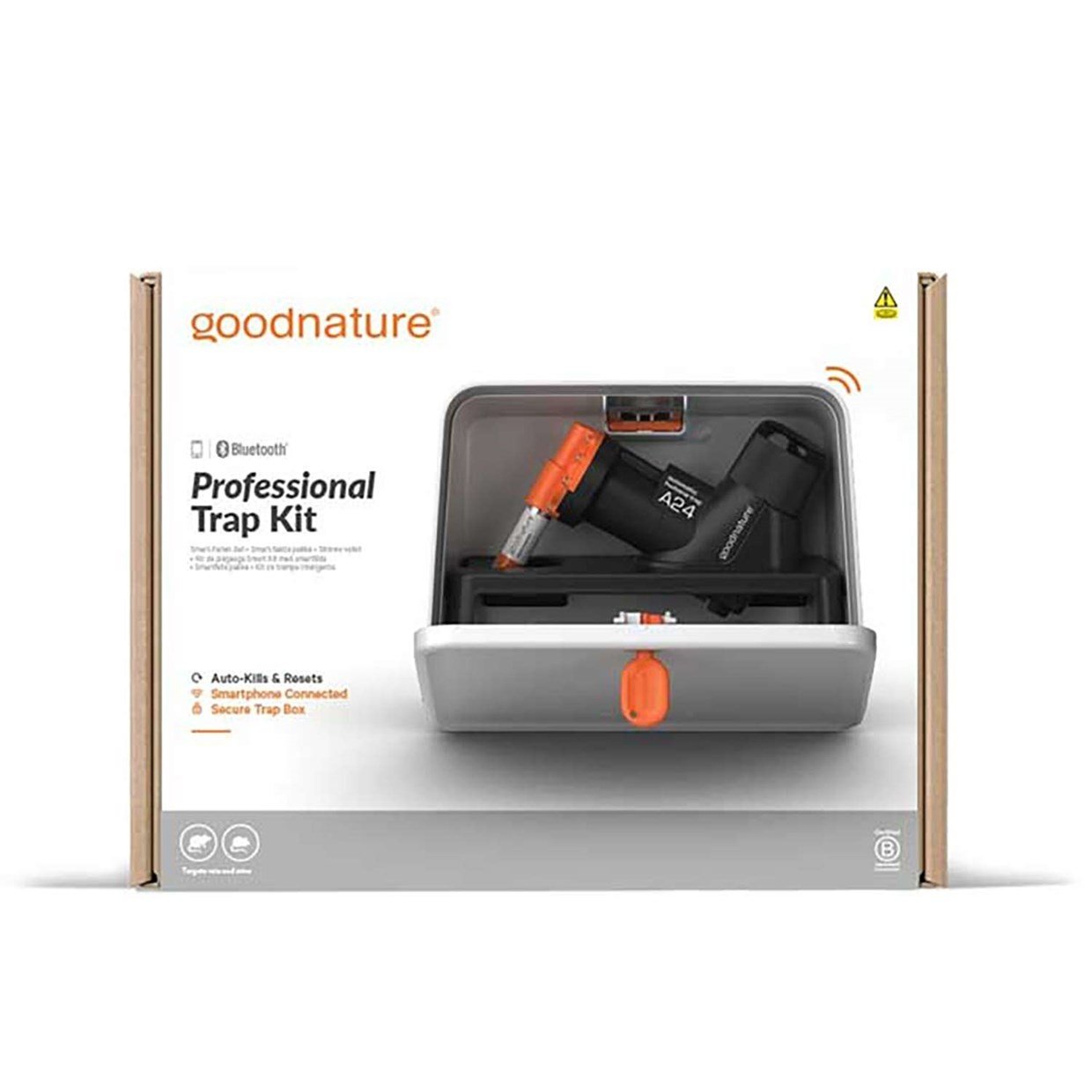 Inhoud 1 Goodnature A24 automatische ratten- en muizenval, 2 x CO2 patronen, automatische lokstofpomp, wandhouder, smart cap, Lure Basket voor eigen lokstof en trapbox.