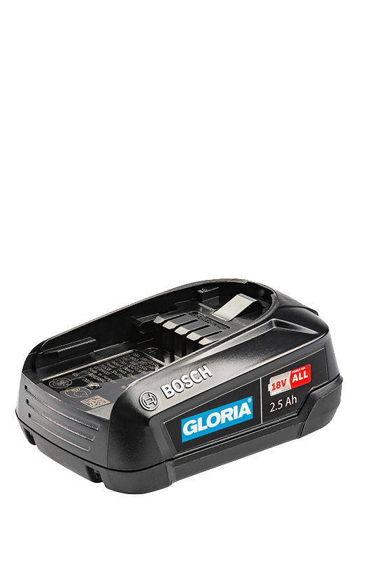 18 V / 2,5 Ah BOSCH POWER FOR ALL accu, geschikt voor alle GLORIA 18 V accu's uit de BOSCH lijn (MultiBrush li-on, WeedBrush li-on en MultiJet 18V) en voor alle andere BOSCH 18 V Home and Garden apparaten.