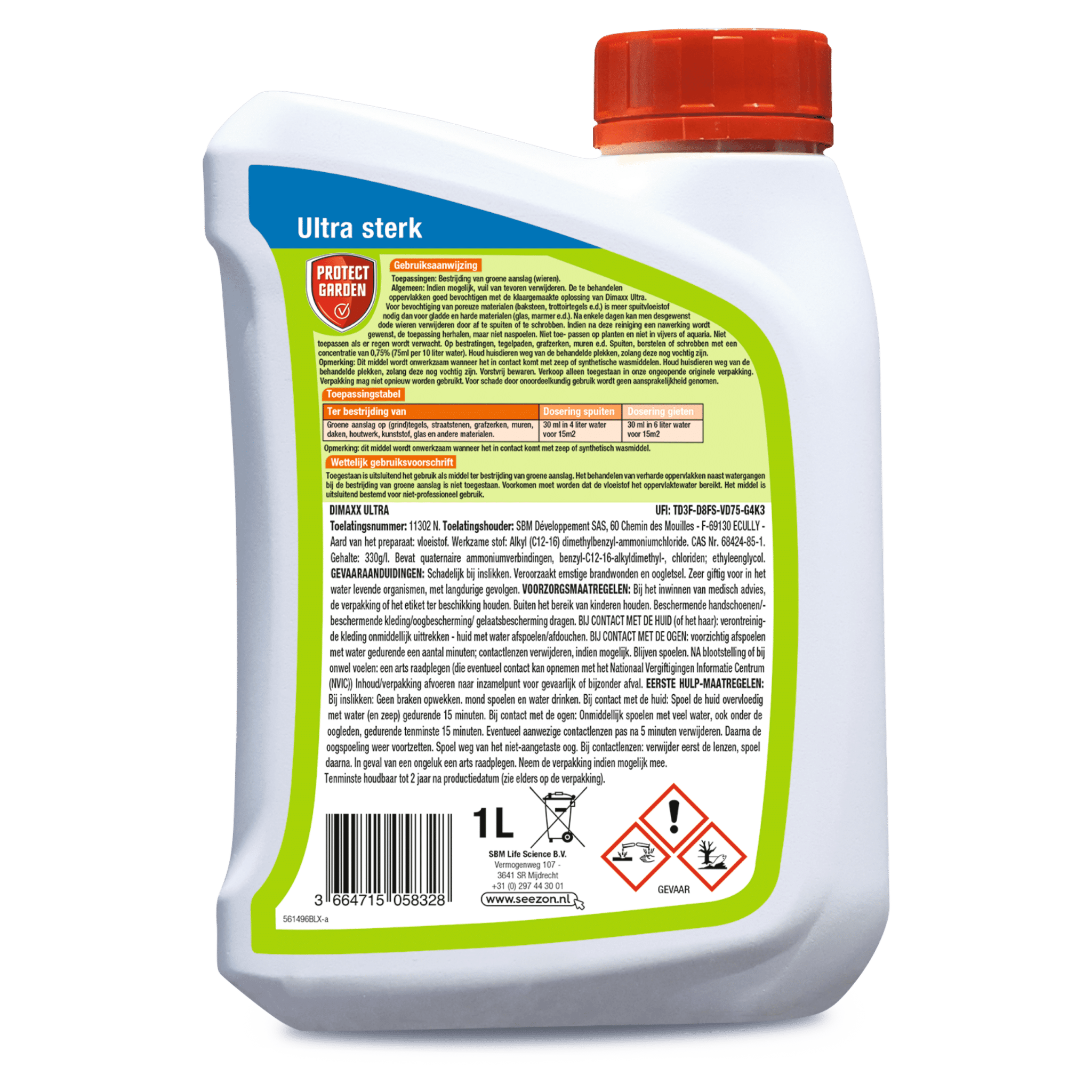 Dimaxx Ultra is zeer geconcentreerd en bestemd voor de bestrijding van groene aanslag (wieren of algen) en kan worden gebruikt op (grind)tegels, grafzerken, muren, daken, hout, kunststof, glas en andere materialen.