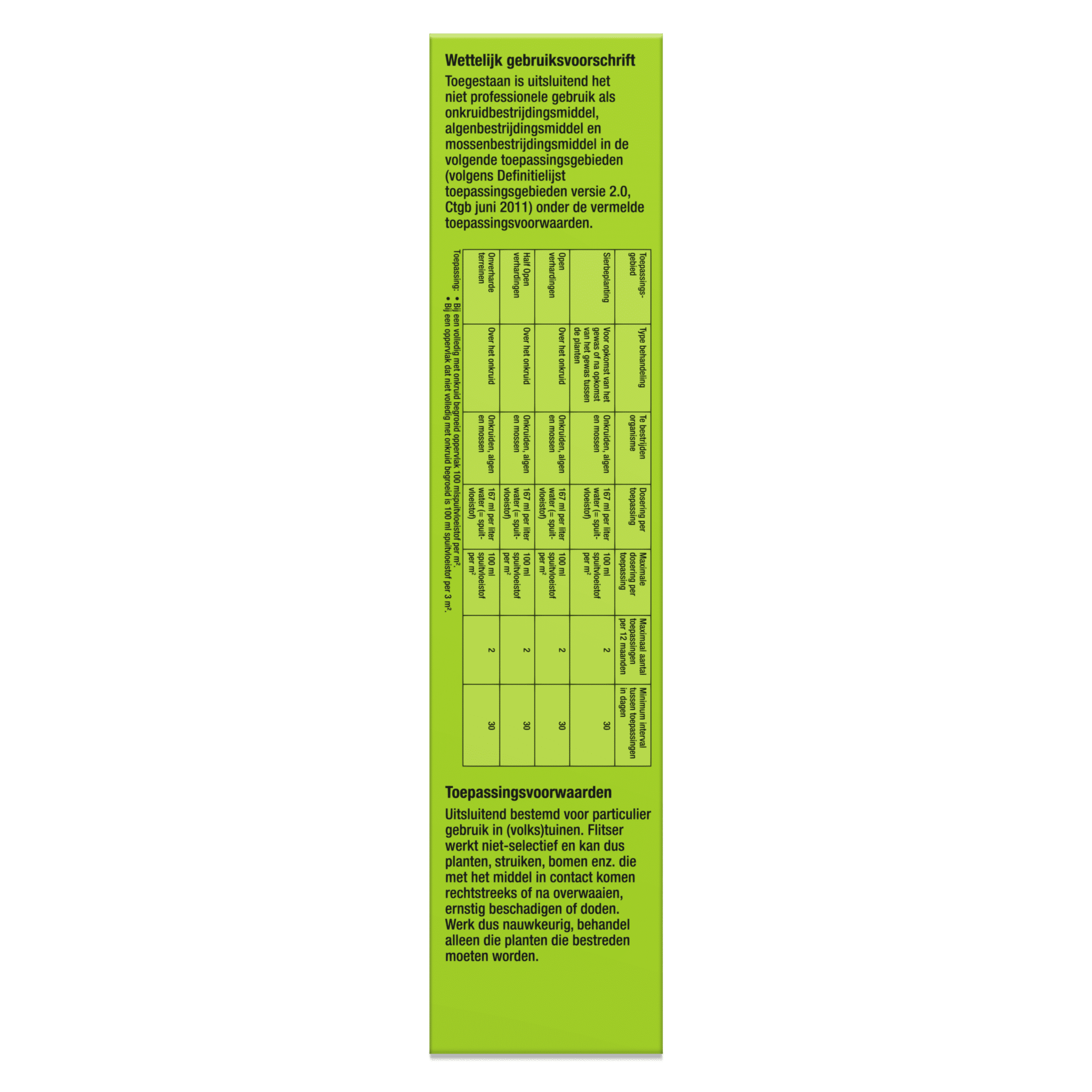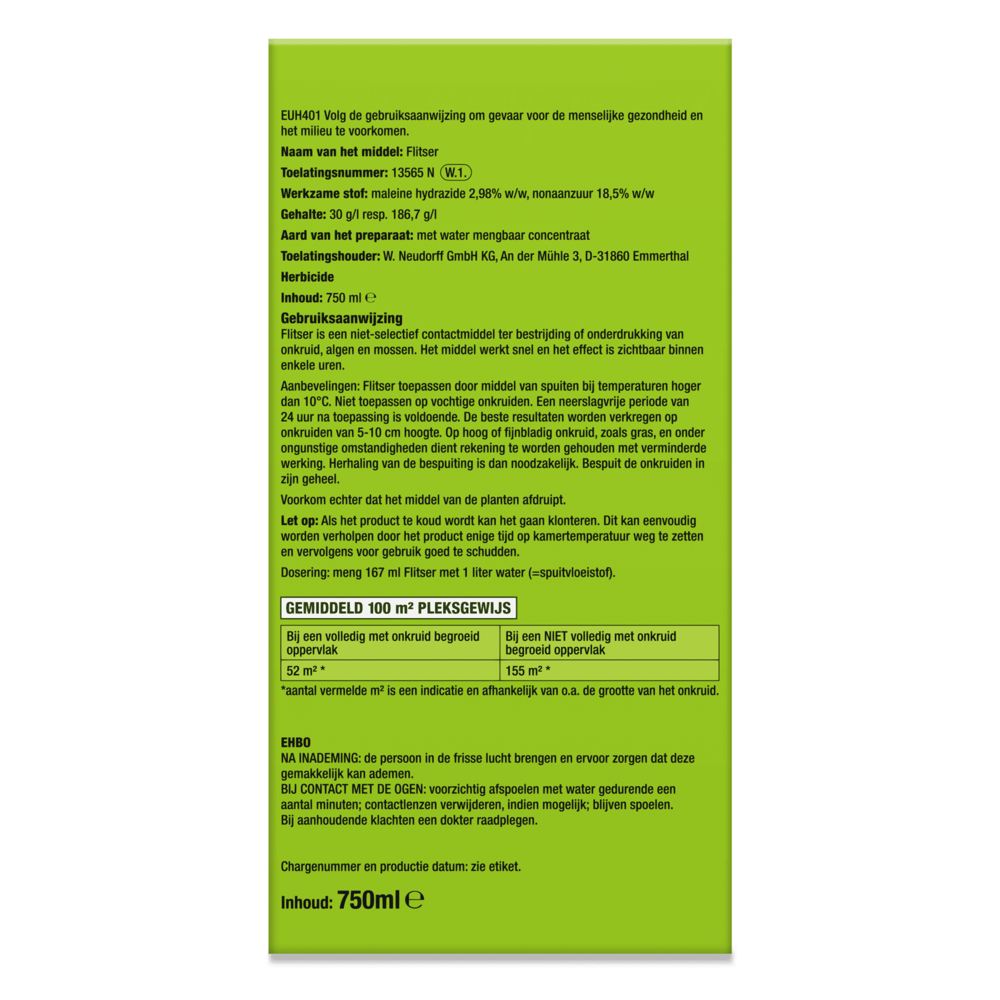 Vermijd gebruik op gazons en randbeplanting, aangezien dit kalkhoudend natuursteen kan beschadigen. We raden aan om eerst een proef op een klein oppervlak uit te voeren. Houd er rekening mee dat Flitser niet selectief is en planten, struiken, bomen, enzovoort, die in contact komen met het product, direct of door overspray, ernstig kan beschadigen of doden. Daarom is nauwkeurige toepassing essentieel; behandel alleen de planten die u wilt bestrijden.Toepassingsperiode: