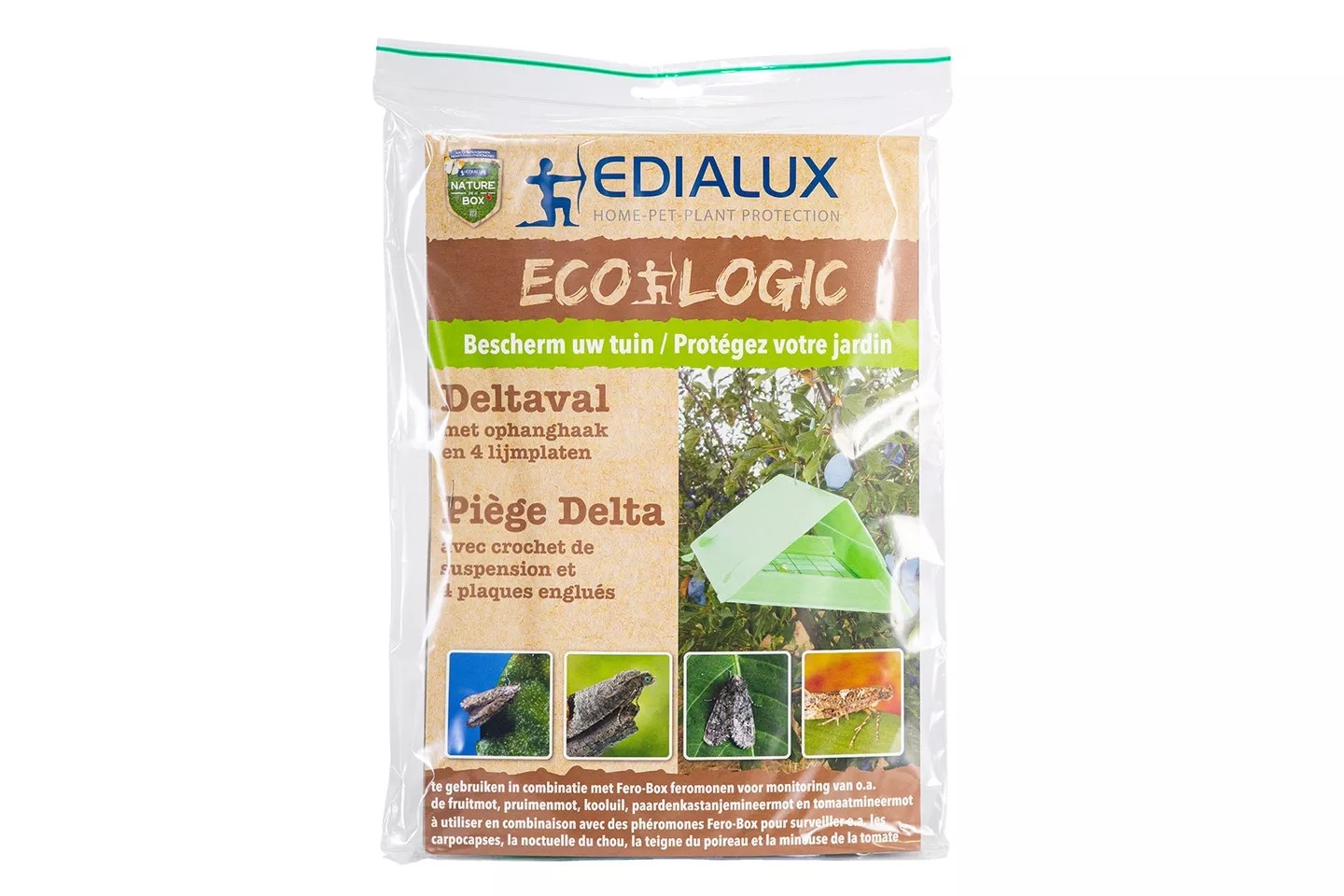 Edialux Deltaval met lijmplaten is een driehoekige feromoonval die wordt gebruikt in combinatie met feromooncapsules* voor het monitoren en beschermen tegen schadelijke motten zoals de fruitmot, pruimenmot, koolmot, preimot, tomaatmineermot en paardenkastanjemineermot.