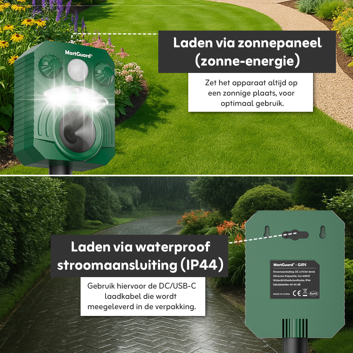 De MartGuard® Garden Secure Pro werkt grotendeels op zonne-energie, waardoor opladen via de USB-kabel vrijwel niet nodig is. Het zonnepaneel vangt voldoende zonlicht op tijdens de momenten dat het apparaat in de tuin staat, waardoor het zichzelf kan opladen door middel van de zon. Toch is de mogelijkheid er om via het stroomnet te laden, dankzij de meegeleverde USB/DC kabel.