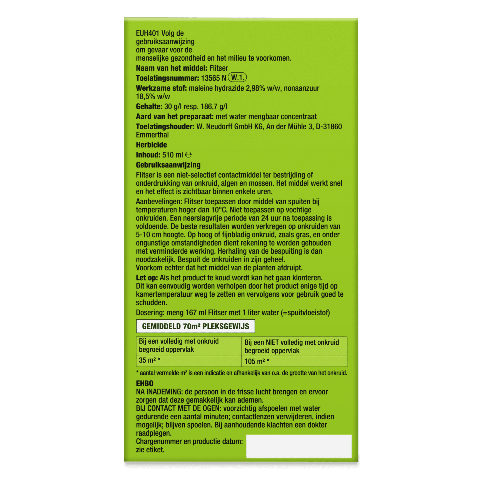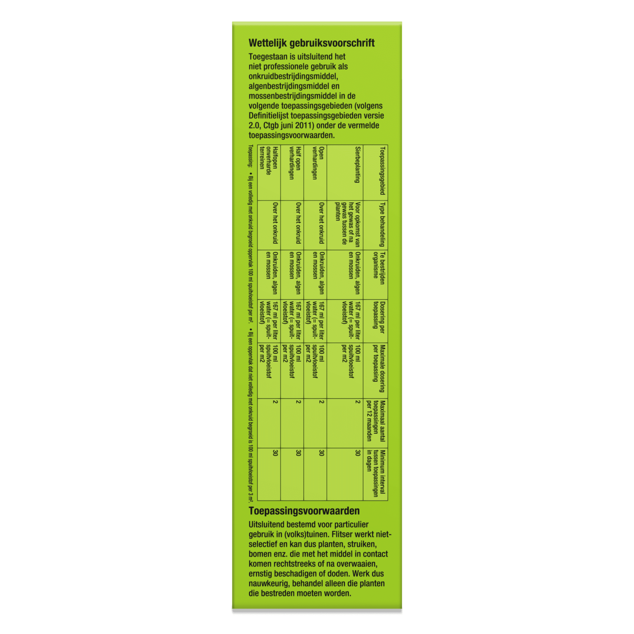 Vermijd gebruik op gazons en randbeplanting, aangezien dit kalkhoudend natuursteen kan beschadigen. We raden aan om eerst een proef op een klein oppervlak uit te voeren. Houd er rekening mee dat Flitser niet selectief is en planten, struiken, bomen, enzovoort, die in contact komen met het product, direct of door overspray, ernstig kan beschadigen of doden. Daarom is nauwkeurige toepassing essentieel; behandel alleen de planten die u wilt bestrijden. Let op: Als het product te koud wordt kan het gaan klonteren. Dit kan eenvoudig worden verholpen door het product enige tijd op kamertemperatuur weg te zetten en vervolgens voor gebruik goed te schudden.