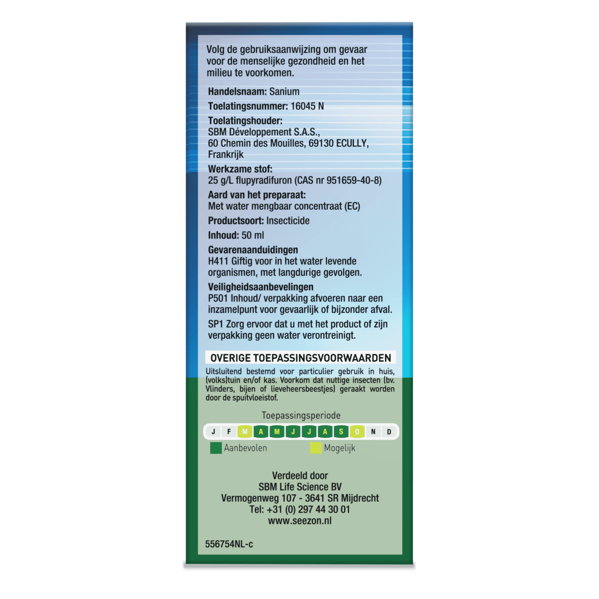 Het product is door zijn systemische werking effectief tegen schadelijke insecten en tegelijkertijd vriendelijk voor nuttige insecten. Sanium concentraat kan worden toegepast op sierplanten, fruit en groenten.
