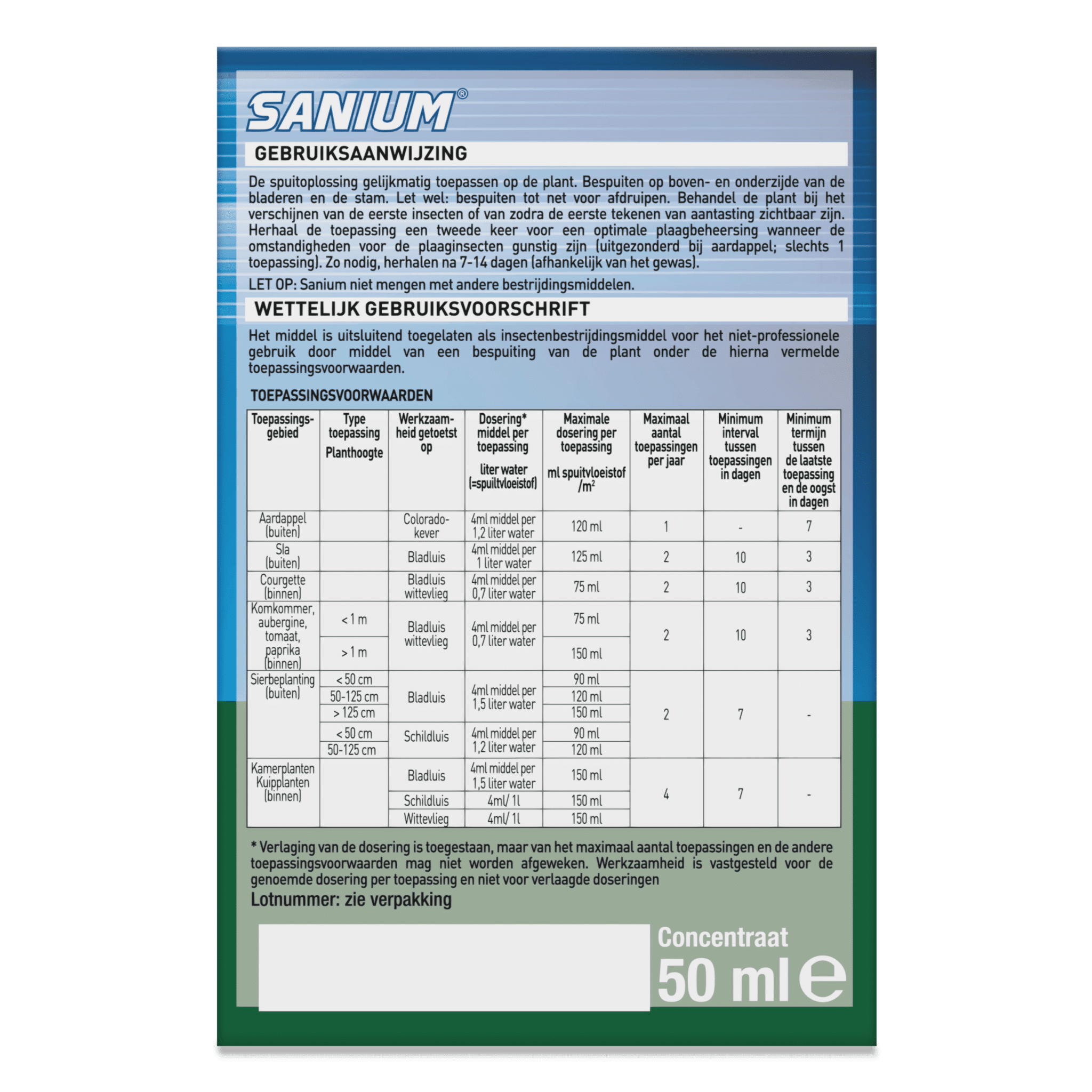 - Flacon van 50ml concentraat voor ca. 11 liter spuitvloeistof.